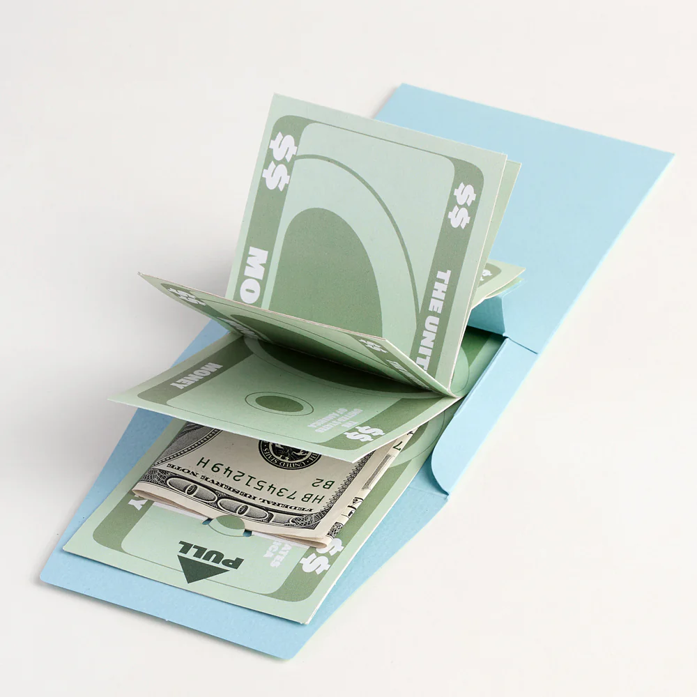 pop-up money holder with automatically folds out when you pull on the tab
