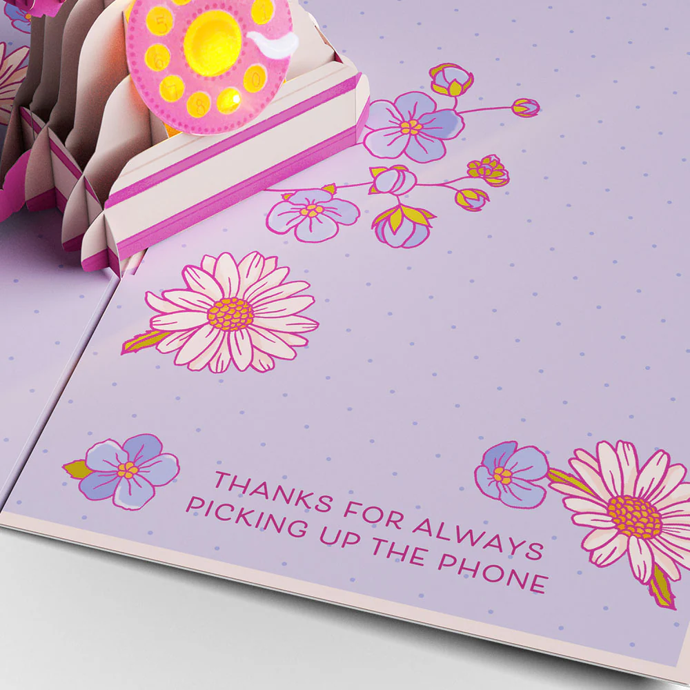 Description: Celebrate Mom with a heartfelt surprise in this charming music and lights pop-up card. The sweet pink cover reads “hey mom” in playful script, surrounded by delicate flowers and confetti-like accents. Inside, a nostalgic 3D vintage rotary phone pops up in soft pink tones, complete with a glowing dial that lights up. Upon opening, the card “rings” and illuminates, bringing the thoughtful message “Thanks for always picking up the phone” to life in a fun and meaningful way. This greeting card is perfect to give to Mom for Mother’s Day, her birthday, or anytime you want to thank her for always being there when you call.